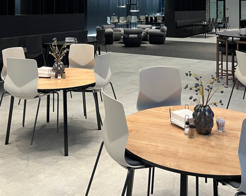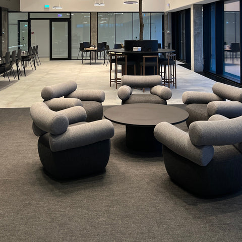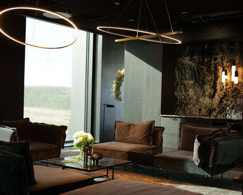 Centralt i designet står de ikoniske belysningsløsninger, hvor runde pendler tilfører et grafisk og næsten svævende element over møde- og loungeområderne. I fællesrum og pauserum er der lagt vægt på fleksibilitet, socialt samvær og uformelle arbejdssituationer. Her mødes runde, indbydende møbler med naturinspirerede detaljer og levende beplantning, som tilfører ro og blødhed til de åbne arkitektoniske linjer.