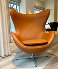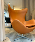Denne Ægget-stol er omhyggeligt ompolstret i walnut Elegance-læder, som tilfører varme, dybde og et eksklusivt præg. Det bløde og slidstærke læder fremhæver stolens organiske formsprog og understøtter dens luksuriøse karakter.